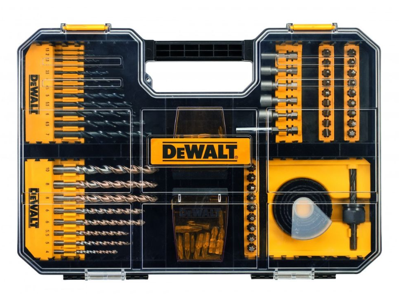 Sadržaj Ph1x2, Ph2x23, Ph3x1, Pz1x2, Pz2x23, Pz3x2, T10x2, T15x2, T20x2, T25x2, T27x2, T30x2, Sl4x1, Sl5x1, Sl6x1, Sl7.2 x1. Zidna svrdla mm: 4, 5, 5,5, 6 x2, 8 x2, 10. HSS svrdla mm: 1,5, 2, 2,5, 3,5, 4,5, 5,5, 5,5, 6, 6,5, 7. Krunska pila mm: 32, 38, 44, 54. Vijak mm: 5, 6, 7, 8, 10. Držač bit nastavaka