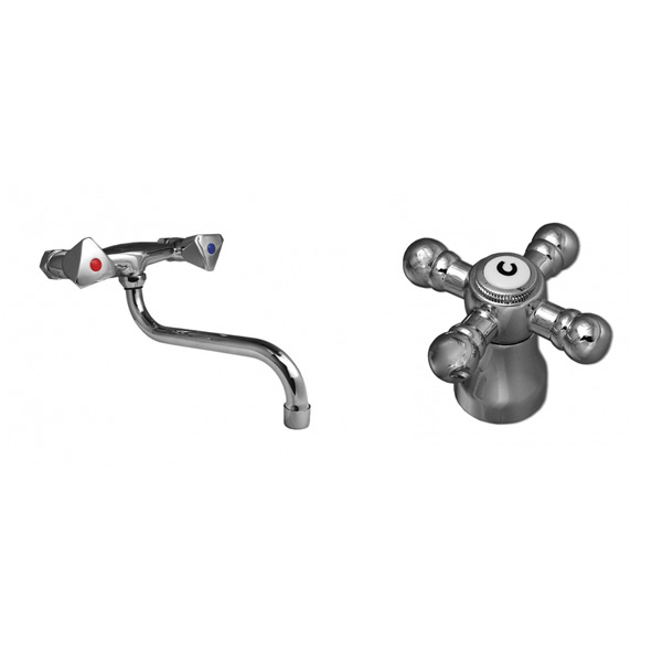 Dvoručna zidna mješalica s “S” izljevom, s keramičkim ventilima i izljevom od 20 cm.